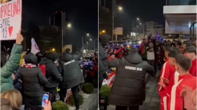 „Să știe toată lumea cine e Dinamo”, au scandat fanii „câinilor”, jucătorii lui Zeljko Kopic ieșind în fața hotelului pentru a asista la show-ul făcut de suporteri.