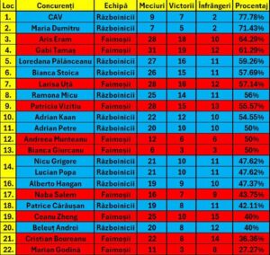 În topul clasamentului conceput pe baza victoriilor de până acum din probele de pe traseu, Războinicul CAV ocupă primul loc (77,78%), urmat de colega lui, Maria Dumitru (71,43%) și Faimosul Aris Eram (64,29%). La polul opus, Cristian Boureanu (36,36%) și Marian Godină (27,27%) ocupă ultimele două locuri în clasament.